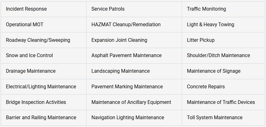 Incident response, traffic monitoring, roadway cleaning, snow and ice control, pavement and concrete repairs, electrical and lighting maintenance, signage and pavement markings, drainage and landscaping maintenance, bridge inspection activities, navigation lighting, barrier and railing maintenance, and toll system maintenance.